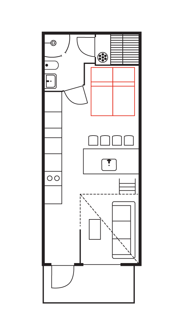This modern apartment offers everything necessary for a four-person family holiday accommodation. The ceiling height is at 3.2 metres, giving the apartment air and a possibility for a loft bed above the living room area. The apartment has also a twin bed.