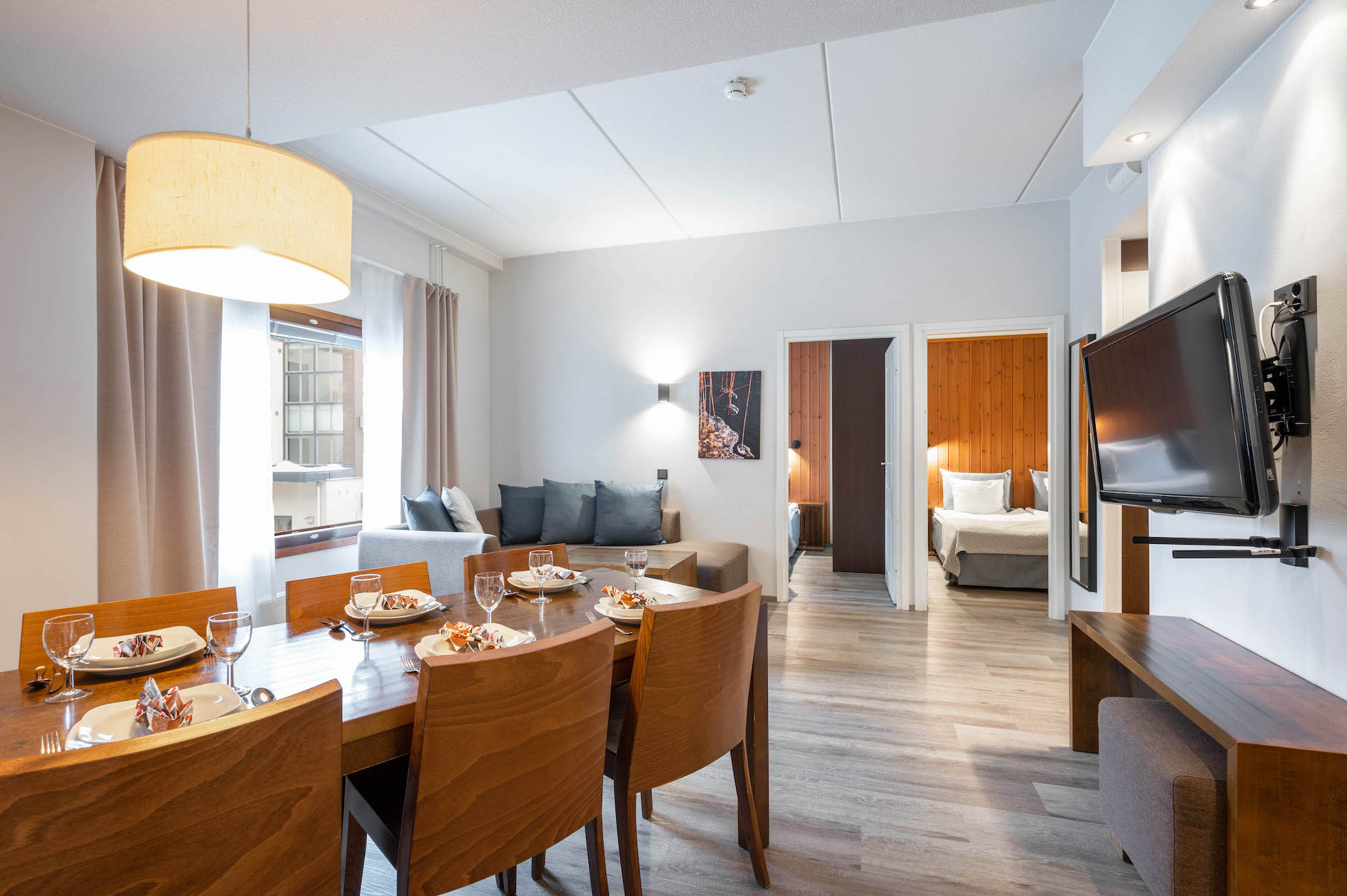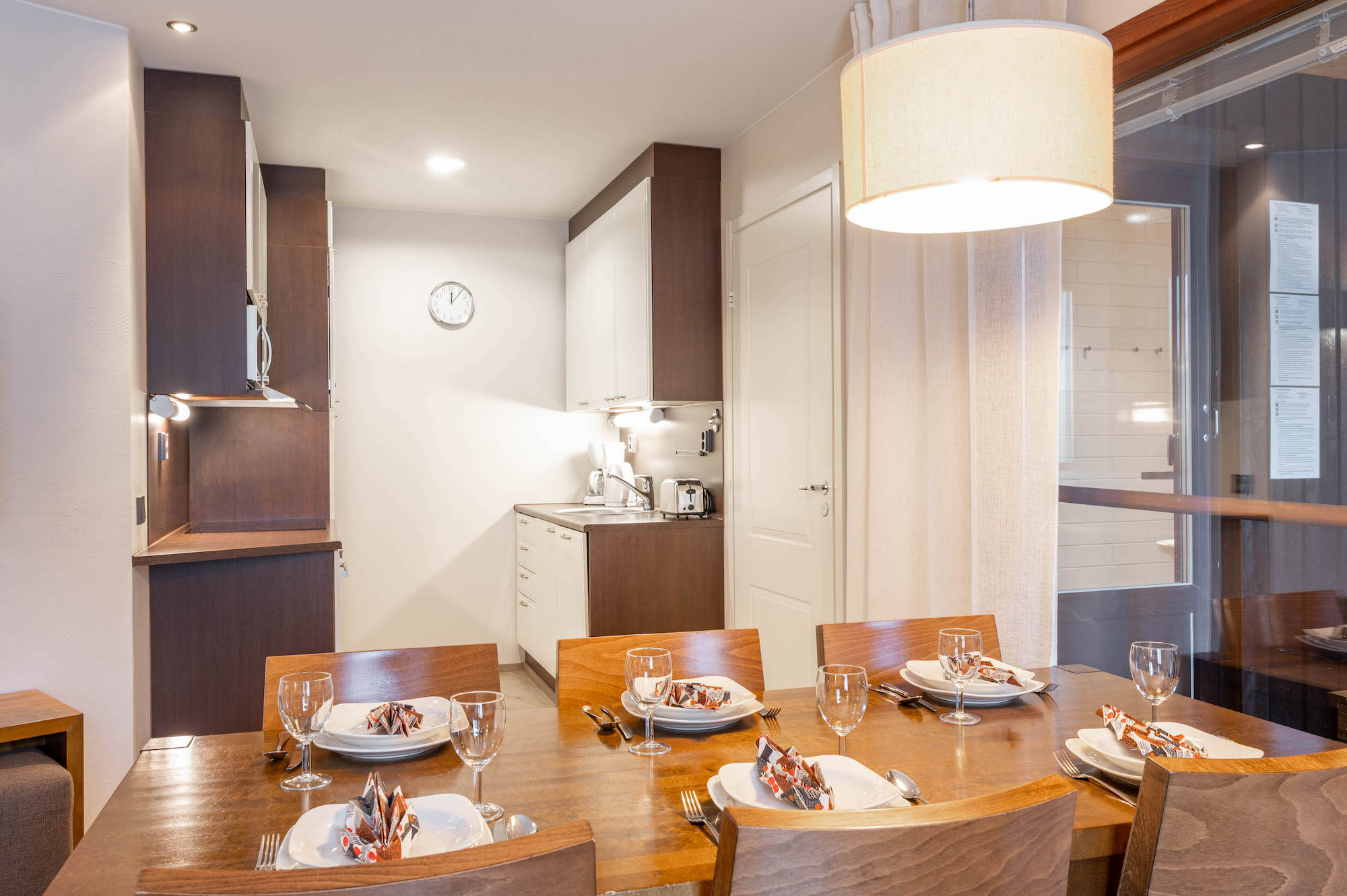 The apartment's storage facilities are designed specially for winter sports enthusiasts. In the hotel common area, all the apartments have also a separate ski locker, and a ski maintenance room is also available. You can park your car in the heated parking garage (320 places, parking fee), which has a direct indoor access to the apartments. Free outdoor parking lots are available at Kelo and Stadion.