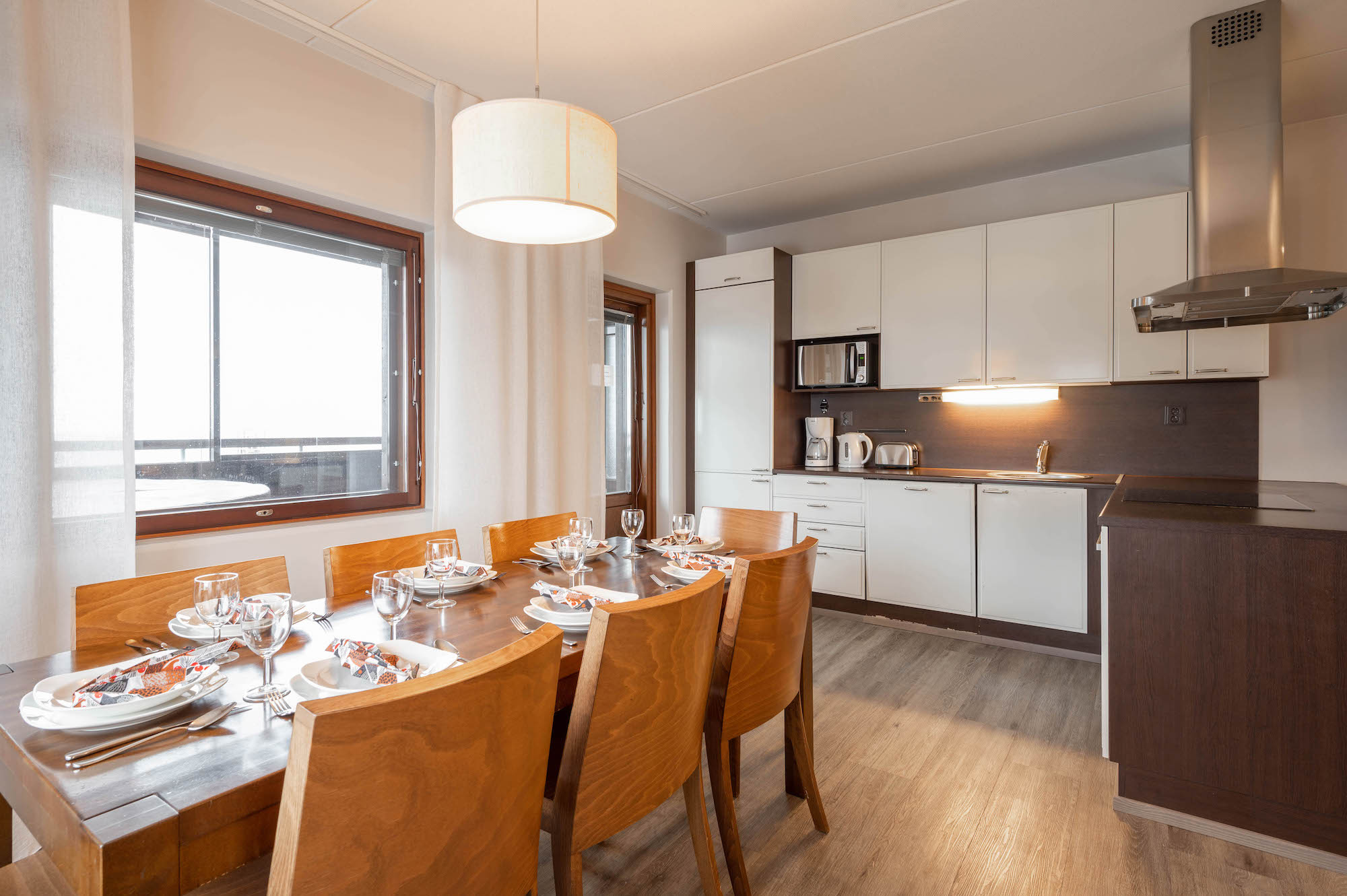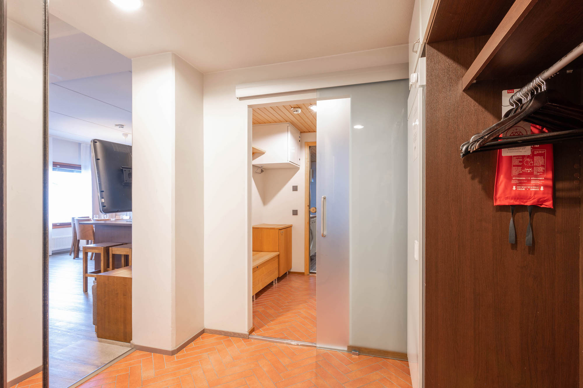 The apartment's storage facilities are specially designed for winter sports enthusiasts. All the apartments also have a separate ski locker, and a ski maintenance room is available in the hotel's common area. You can park your car in the heated parking garage (320 places, parking fee), which has a direct indoor access to the apartments. Free outdoor parking lots are available at Kelo and Stadion.