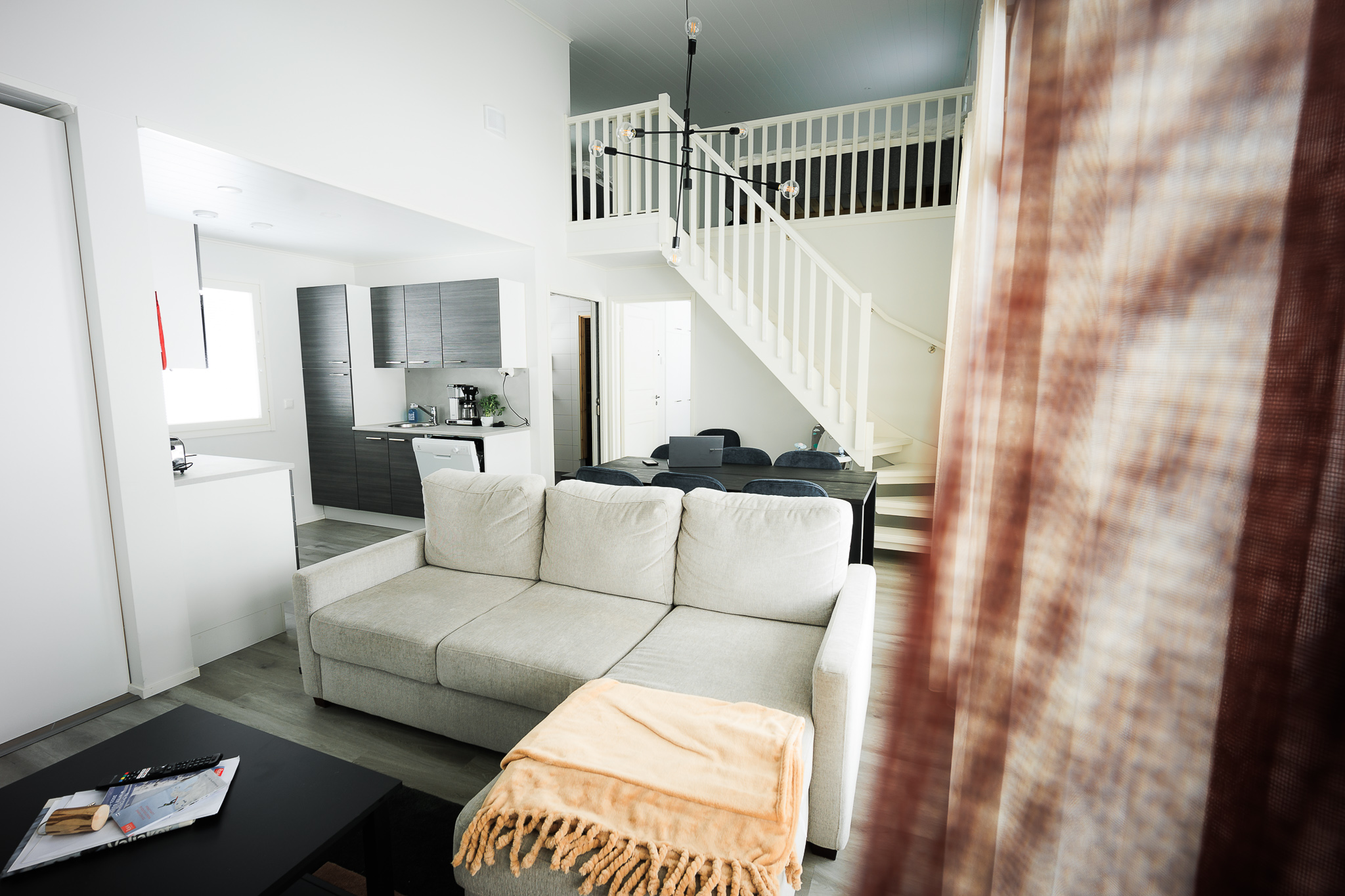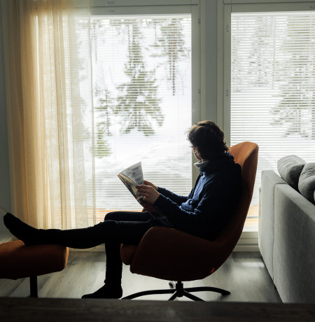 Relaxing in the living room in Rukalodge. Photo: Mikko Santasalo