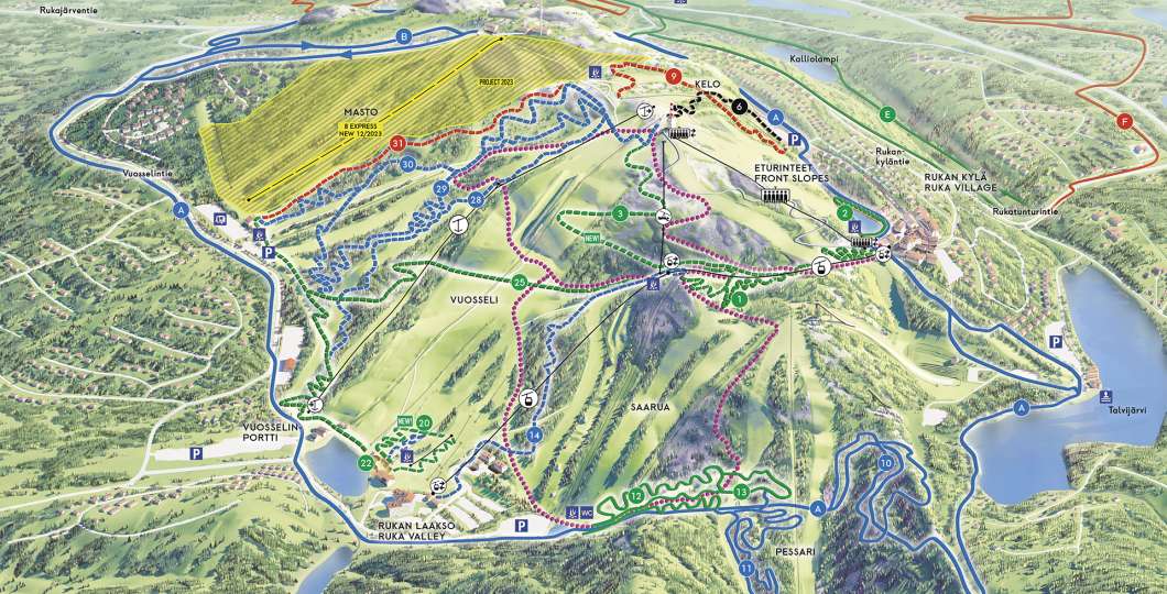 Bike Park has four lifts for bikers: Village-2-Valley Gondola, Village-Express chair lift, Vuosselin Kulma anchor lift and Family Park carpet lift.