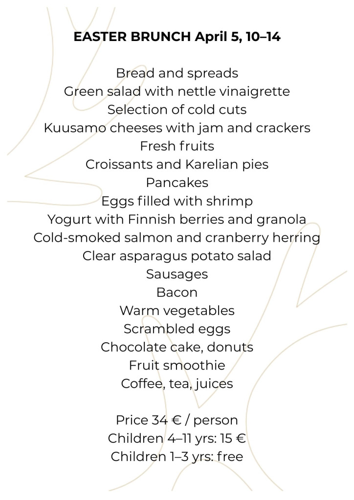 Easter brunch at Kultala on April 5th from 10 am to 2 pm