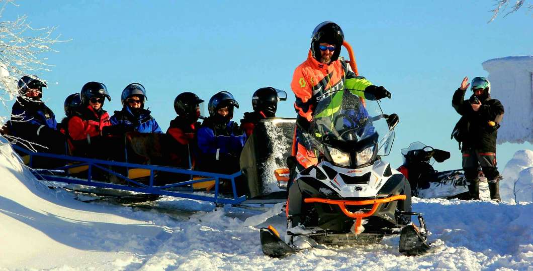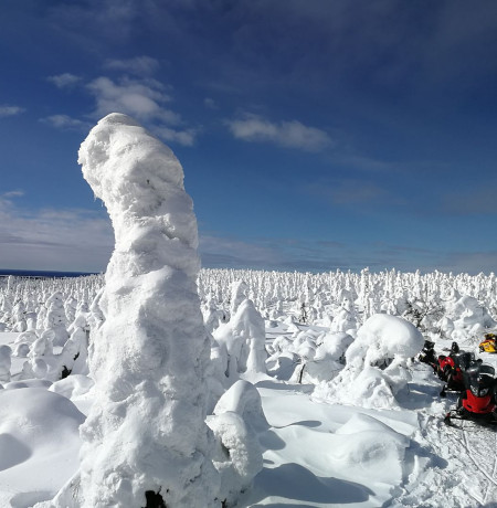 Snowmobile sledge takes you through the Kuusamo wilderness. View and the snow-laden trees are magical. Hot juice is served by the fire.