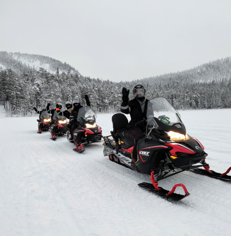 Start at Ruka on a snowmobile to experience one of the most magnificent snowmobile routes in Finland. Suitable for families. A heated sled is also available for children.