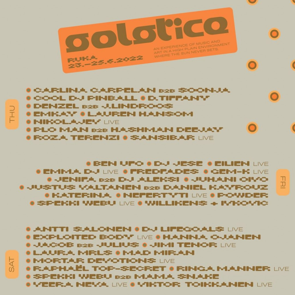 Solstice is a festival of electronic dance music, experimental music and diverse art at the top of Ruka at Midsummer. An experience of music and arts in a high plain environment where the sun never sets.