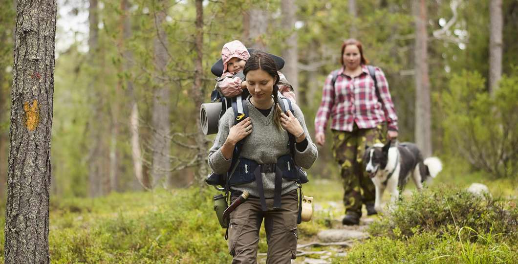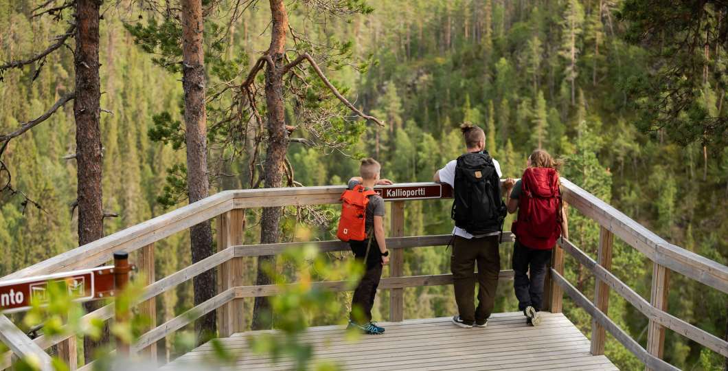 The Könkään keino Day Trip Trail (1 km) leading to Kiutaköngäs waterfall, the snow shoe and fatbike trail (6 km) leading to Lammintupa and the Konttaisen kuhaus Trail (1.5 km) running up on Konttainen are all suitable for the entire family. These trails are partially paved or so frequently used that you won’t need snowshoes, except after very heavy snowfall.