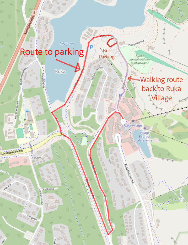The best place to park in Ruka village is the parking garage. The taxi rank will remain in its place opposite the Zone. A parking space has been reserved for buses at the Stadium.