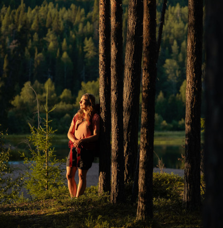 Retkeilijä nojaa puuhun ja nauttii maisemista, Ruka-Kuusamo, kuva Jani Kärppä