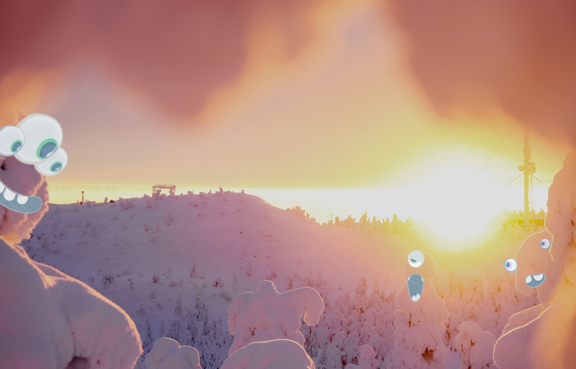 Long before us, thousands of years ago, there was the first winter of ages. Back then, the fells rose above Ruka, and the forests were filled with snowy wonders. As the mist and freezing wind embraced the trees, the first snow monsters were born. Although they may appear at first glance as snow-covered trees, a closer look reveals that life lurks within the snow.