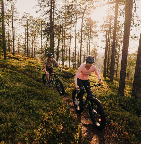 Maastopyöräilyn vauhtiin kannattaa tempautua niin Ruka Bike Parkissa kuin Hossan upeilla poluillakin. Jos taas menopelisi on gravel-pyörä, tarjolla on 900 km graveliin sopivia reittejä.