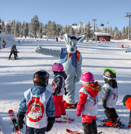 Ryhmien kokoontuminen on Itä-Rukalla, Ski Bistro ravintolan terassin ja Vuosselin Ankkurihissin välisellä tasangolla, Hiihtokoulun ryhmien laji- / tasokylttien luona.
