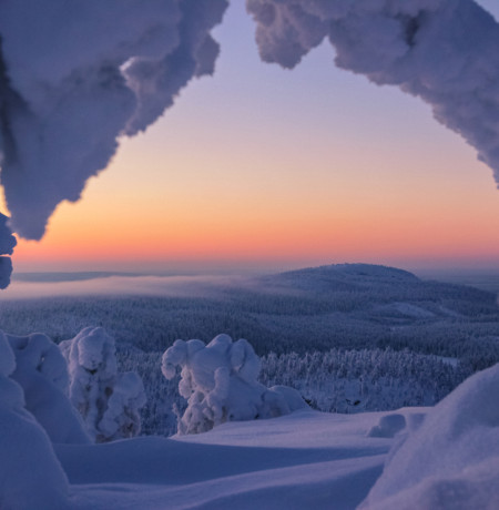 The name of Juhannuskallio, the Midsummer Rock, which is located close to the peak of Rukatunturi fell, derives from the Midsummer celebrations that were once held on the rock and at its base. Grand views open up from the top of Juhannuskallio in the surroundings of Ruka, even all the way to Russia. In the winter, the snowshoeing trail leading to Juhannuskallio is the perfect spot for admiring crown snow-loads on trees.