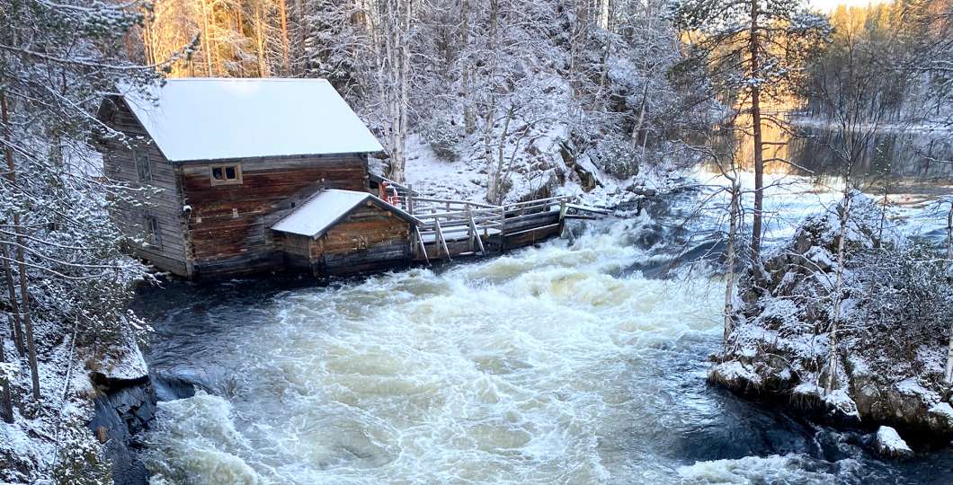 Myllykoski waterfall, located along Kuusamo’s most popular day trail, Pieni Karhunkierros Trail, lets the hiker wander all the way down to the raging waters. Built in 1926, the former mill is now open to hikers in the day time so they can catch their breath, and a lovely scene opens up from the mill bridge towards the suspension bridge crossing River Kitkajoki.