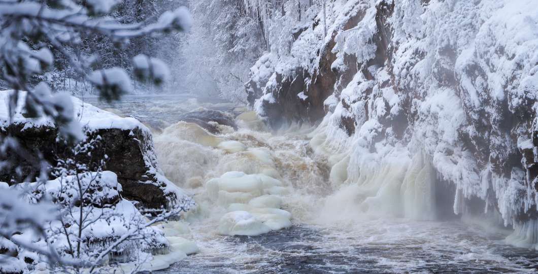 Located in the Oulanka river valley, Kiutaköngäs is among the most popular waterfalls in Finland. A marked path leads you right next to the waterfall. The flooding Kiutaköngäs in the springtime is quite the sight. In the winter, beautiful ice and snow bridges are created on the edges of the waterfall.