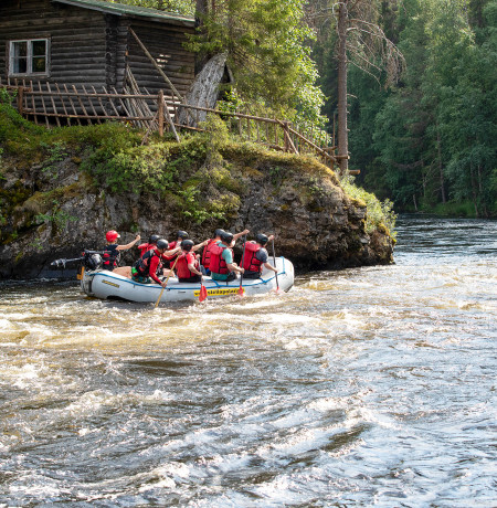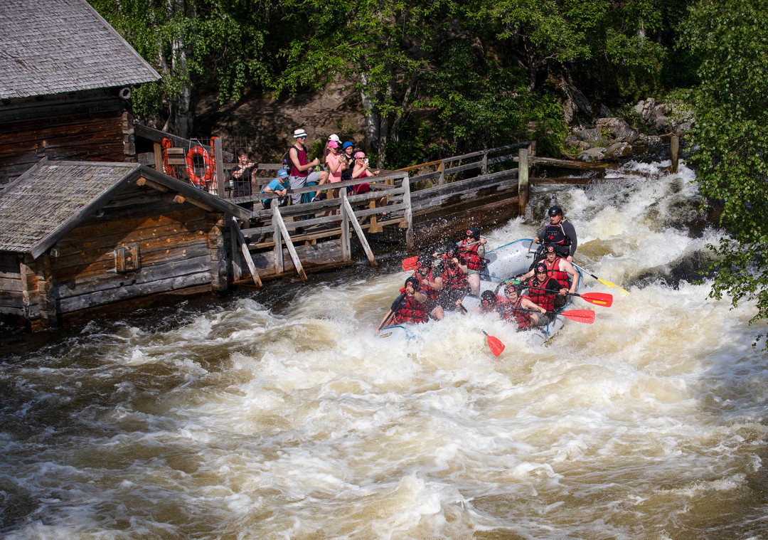 Myllykoskea lähestyessämme näen jo kaukaa, että tämä onkin villimpi tapaus. Valkoiset kuohut kiehuvat ja kieppuvat. Sivusilmällä huomaan joen yli kulkevalla riippusillalla ja vanhalla myllyllä meitä valokuvaavia ihmisiä. Paparazzeja vai Pienen Karhunkierroksen kiertäjiä, ehdin ajatella, kun yhtäkkiä lautta sukeltaa jäätävään koskeen ja ponnahtaa hetken päästä kuin korkki takaisin pinnalle. Sydän pamppailee, olen adrenaliinin vallassa ja melon kuin heikkopäinen. Märkiä housuja ei edes huomaa.