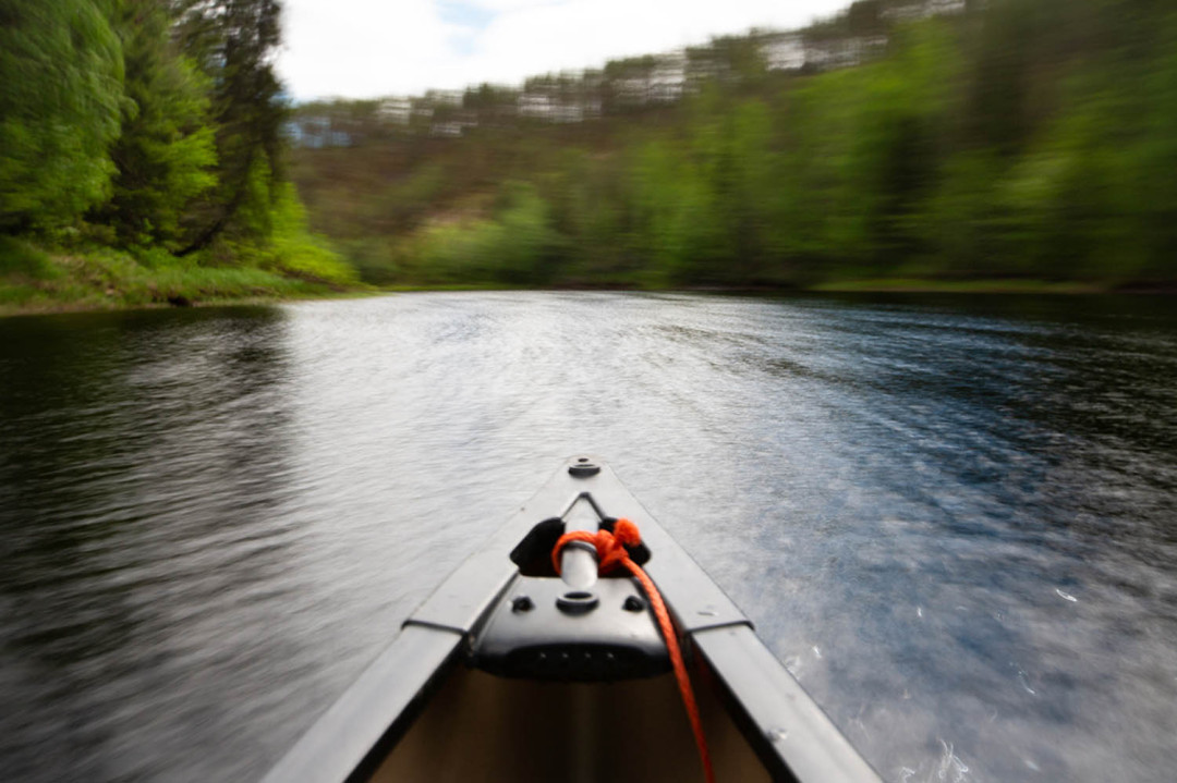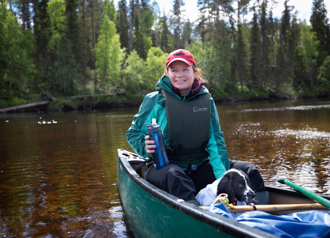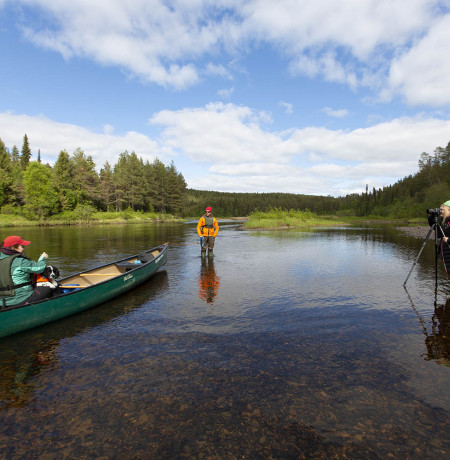 Tutkijoita taitaa hieman jännittää; kumpikaan ei ole melonut aiemmin. Perheeni kaksi koiraa lähtee mukaan retkelle, sillä ne ovat osasyy siihen, että viihdyn metsässä päivittäin. Hintavan kuvauskaluston, kokemattomien melojien ja kolmen kuukauden ikäisen pennun sovittaminen samaan kanoottiin ei vastaa käsitystäni leppoisasta melontaretkestä, joten mieheni Teemu on ystävällisesti lupautunut lähtemään avukseni joelle. Olemme molemmat kokeneita koskimelojia ja jaamme kuvaajat, koirat ja kaluston tasan kahteen kanoottiin. Kuvaajat voivat keskittyä kuvaamiseen ja me hoidamme Teemun kanssa melomisen.