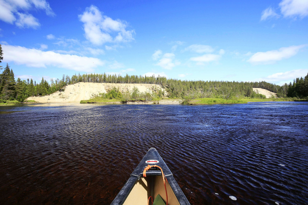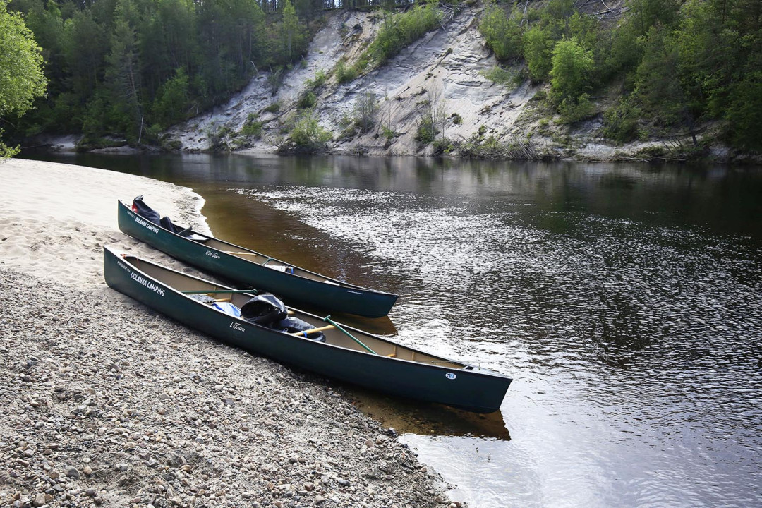 Matkan jatkuessa Mopo käpertyy taas päiväunille kanootin pohjalle. Ilmoitan Arille noutoajan ja melomme reippaasti kohti noutopaikkaa. Janeten kamera räpsyy toki edelleen, sillä nyt Oulanka tarjoilee komeimpia hiekkapenkereitään. Poroja ei tällä kertaa näy missään, vain niiden käyttämät polut jyrkillä rantapenkoilla kertovat hiekkarantojen olevan porojen suosiossa. Törmäpääskyt pyrähtelevät ulos pesäkoloistaan. Kunpa retki ei päättyisikään! Mielessäni päätän, että seuraavalla Oulangan melontaretkellä varaamme aikaa kahden päivän ajan ja yövymme teltoissa Sirkkapuron tai Alaniemen laavulla.