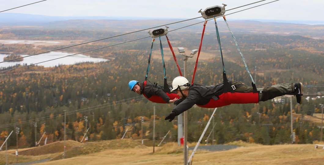 Liukuminen 364 metriä huipulta huipulle tarjoaa vauhdikasta jännitystä ympäri vuoden. Voit liukua yksin tai yhtä aikaa kaverin kanssa. Turvallisuudesta huolehditaan tietystikin tarkasti.