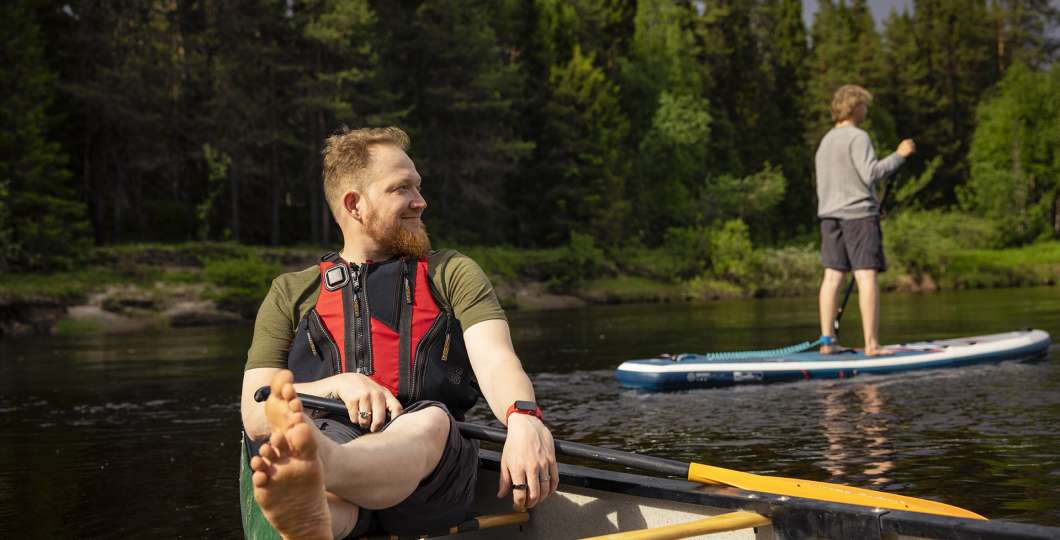 Rauhallisemmasta menosta pitäville sopii melontaretki kanootilla Oulankajoella tai suppailu Talvijärvellä.