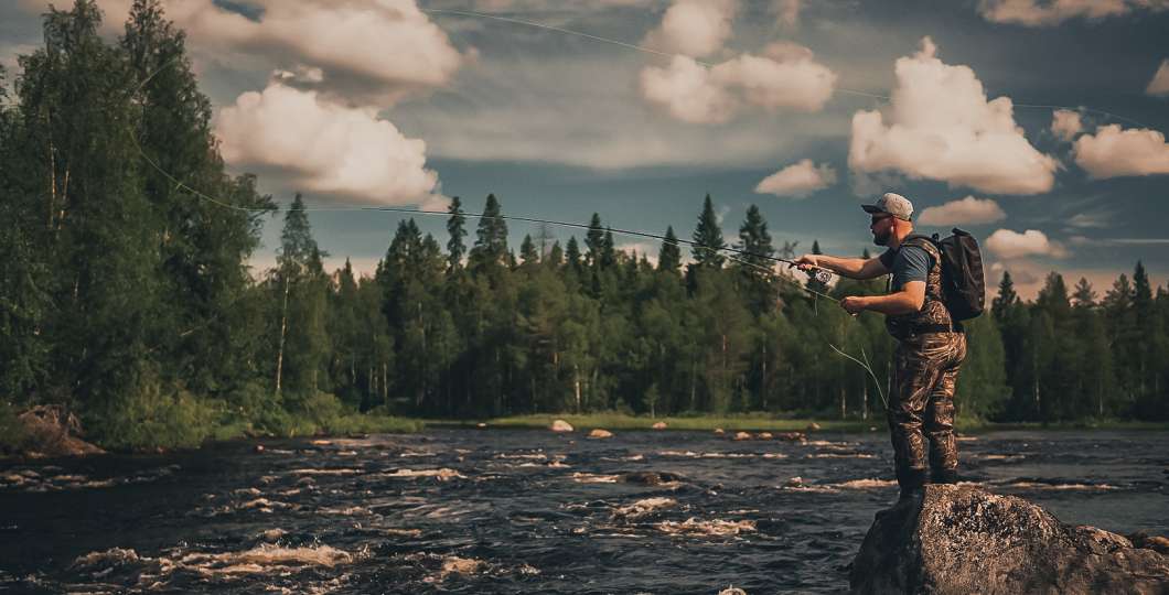 Kalastaja heittää perhoa kivellä Ruka-Kuusamossa