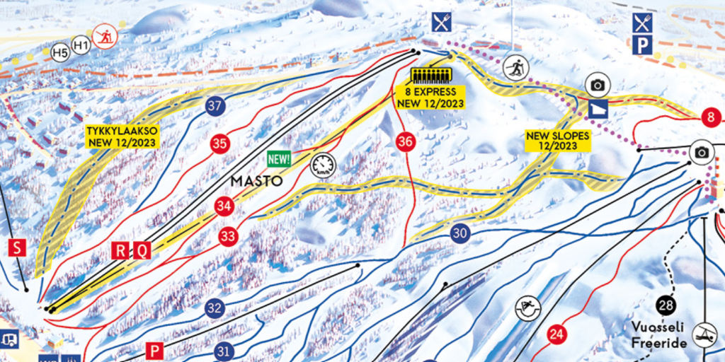 Uusi Tykkylaakso-seikkailurinne kuvan vasemmassa laidassa tulee kiertämään yläasemalta Juhannuskalliontien vierustaa mukaillen, MastonAitio Ski-Inn mökkien vierestä alas Maston hissien ala-asemalle. Rinneuutuuksien joukossa on myös kokonaan uudet rinteet Maston huipulta Kelon rinteeseen sekä siitä Vuosseliin haarautuva rinne. Myös Vuosseli Expressin yläasemalta Maston ala-asemalle tulee lähtemään uusi rinne, joka tekee Vuosselista Mastolle siirtymisen nykyistä sujuvammaksi.