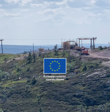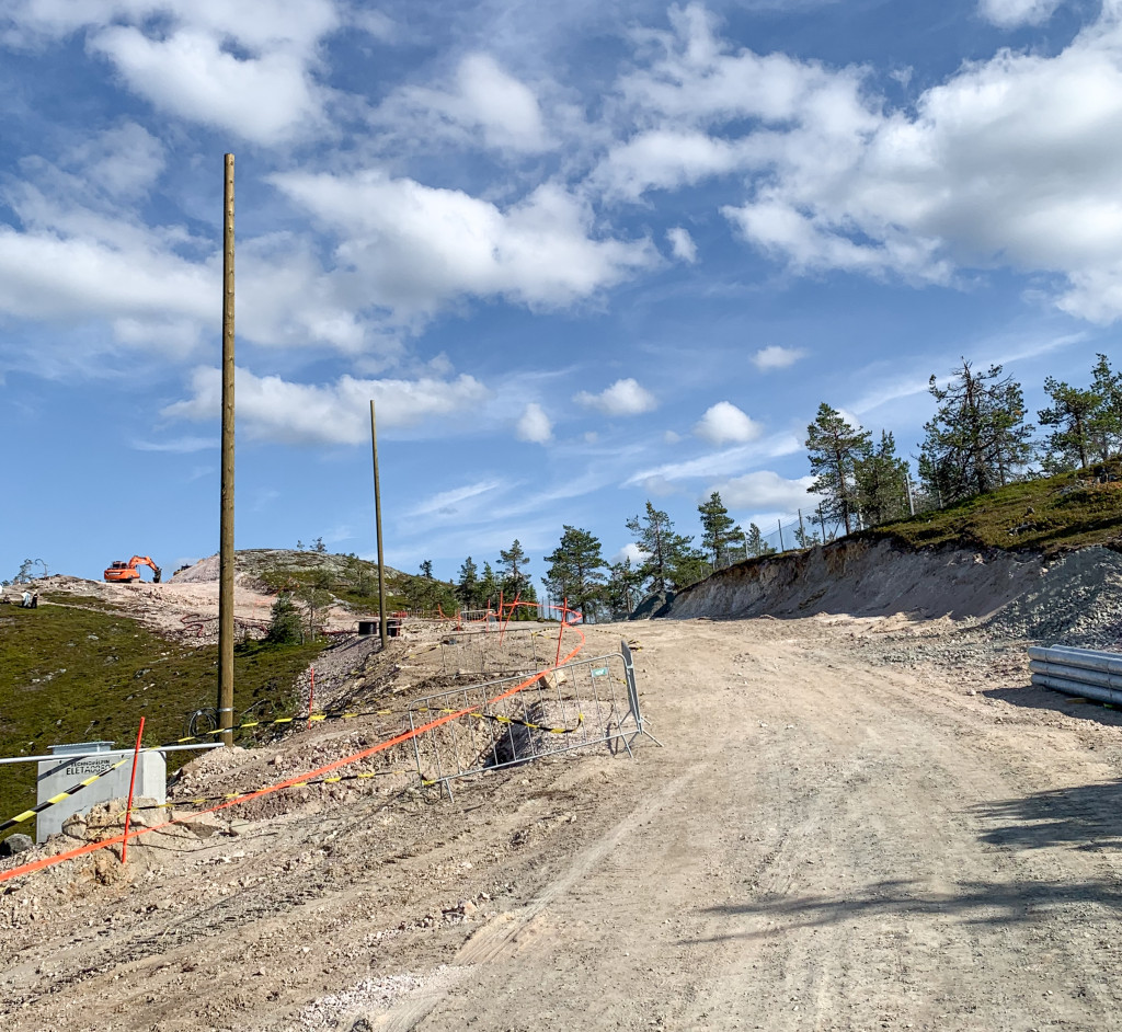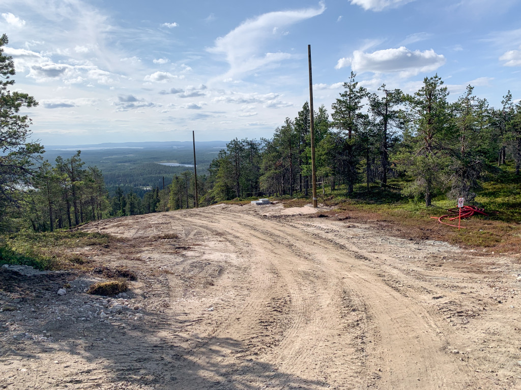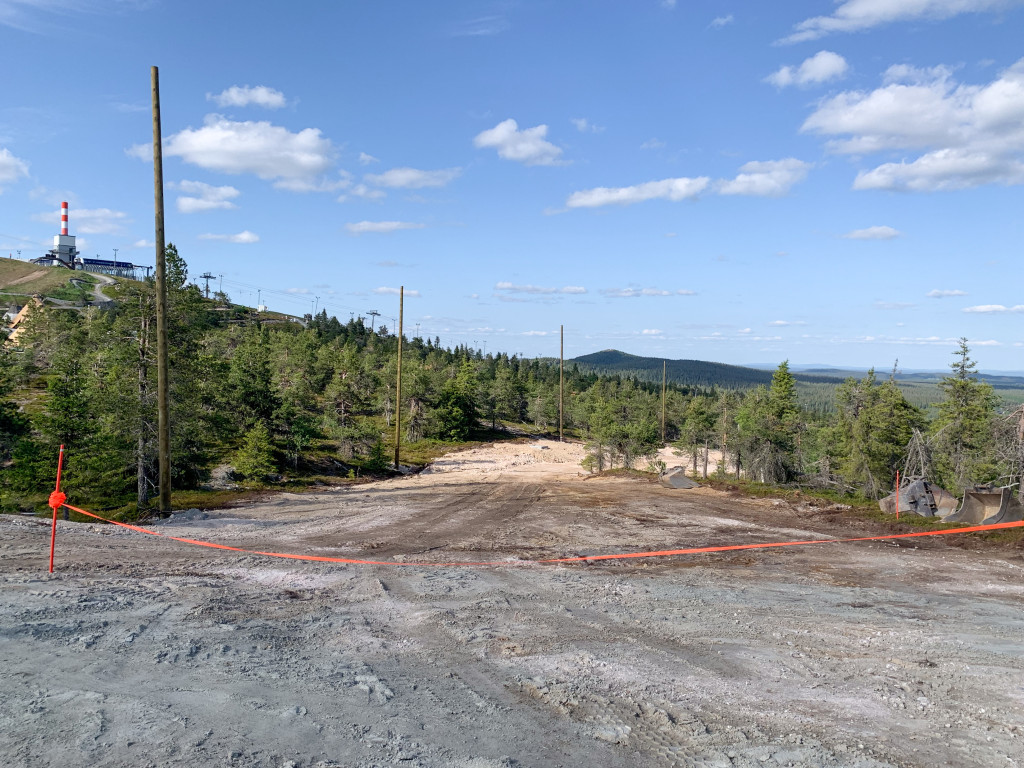 Kuva: Maston yläaseman työmaa. Rakennustöiden vuoksi Juhannuskalliontien päästä lähtevä Rukan huipulle johtava sorastettu reitti on suljettu.