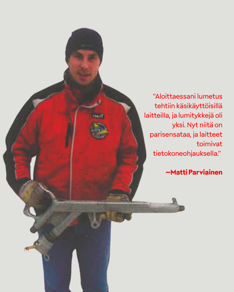 – Ennen Rukan kylällä juoksivat lokakuussa lähinnä jänikset ja oravat eikä paljon muuta elämää ollut. Säilölumen ansiosta kausi on pidempi, ja voimme taata hyvät olosuhteet niin kilpaurheilijoille kuin harrastajillekin. Aloittaessani lumetus tehtiin käsikäyttöisillä laitteilla, ja lumitykkejä oli yksi. Nyt niitä on parisensataa, ja laitteet toimivat tietokoneohjauksella. Rinnekoneiden jälki on samettinen, eikä kiviä tarvitse enää pelätä. Hissilippuja tarkistettiin urani alussa reikäleimasimella, ja nyt silläkin puolella tietotekniikka on mullistanut kaiken. Rukan ja Pyhän toimintojen merkittävä kehittyminen on tuonut motivaatiota työhön, Parviainen sanoo.