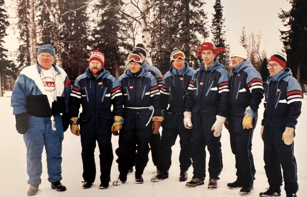 Arkistokuvassa vasemmalta Juhani Aho ja Hannu Jokinen, neljäntenä vasemmalta Kari Jussi Aho ja hänen vieressään rinnepäällikkö Matti Parviainen.