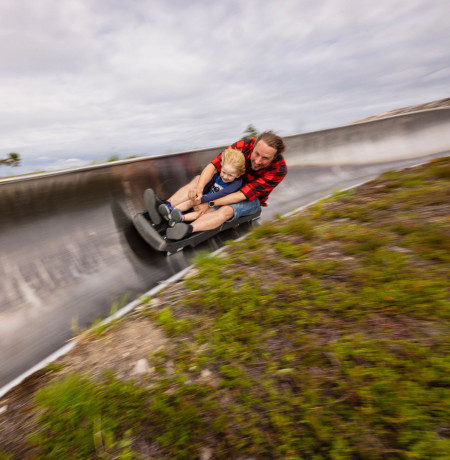 Village Express -maisemahissillä Rukan huipulle ja alas kesäkelkkarataa tai loppukesästä avautuvaa Ruka Coasteria pitkin yhdessä lapsen kanssa.
