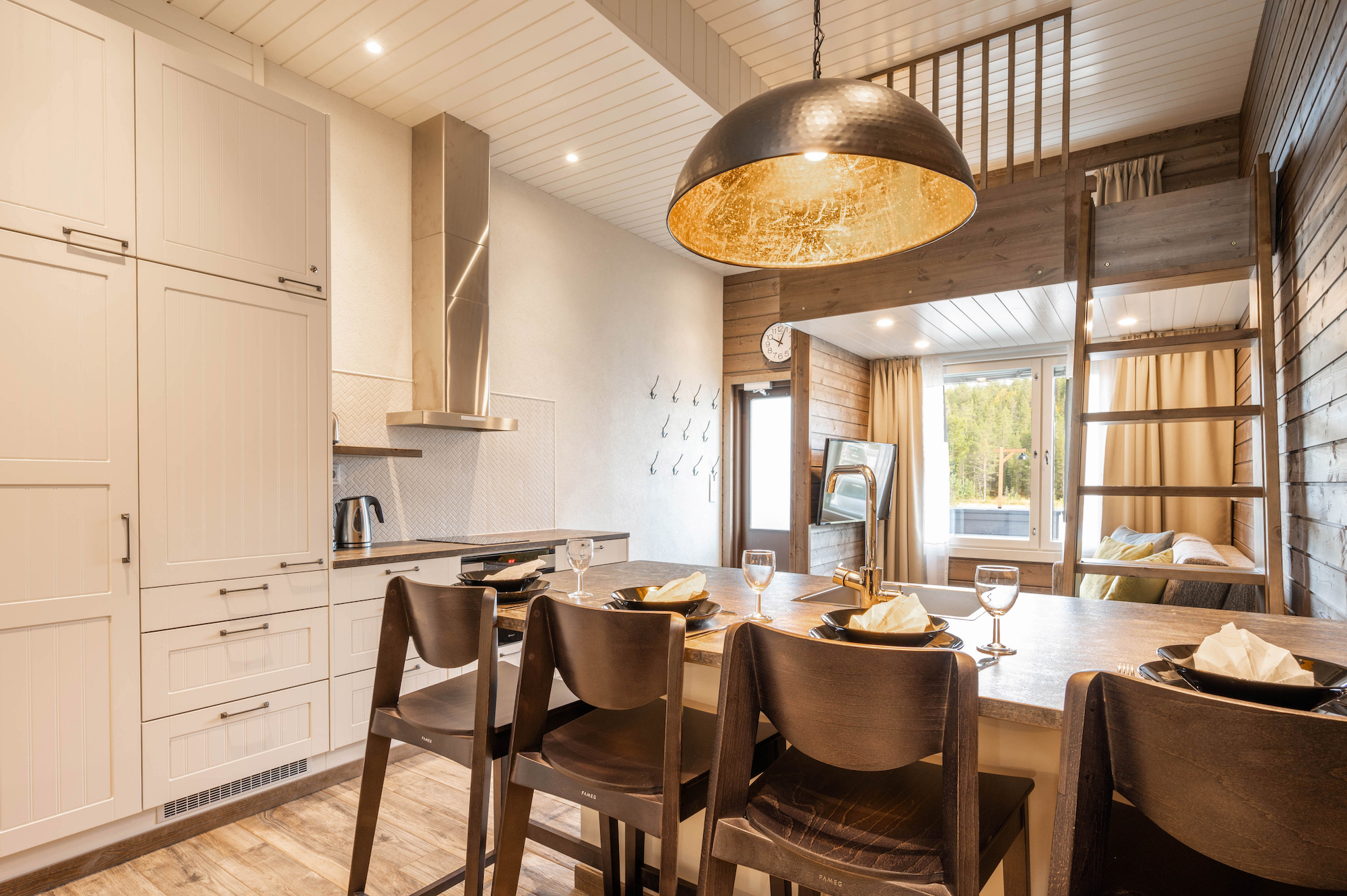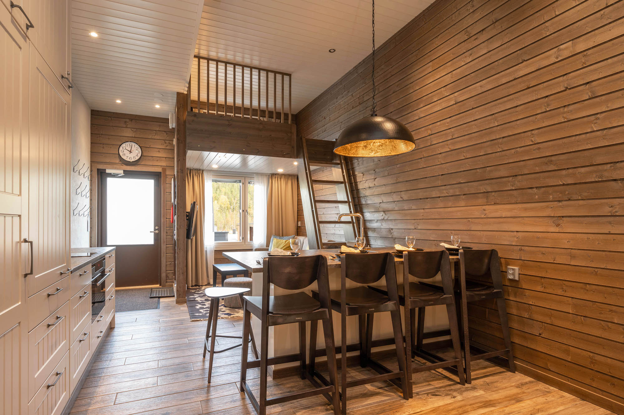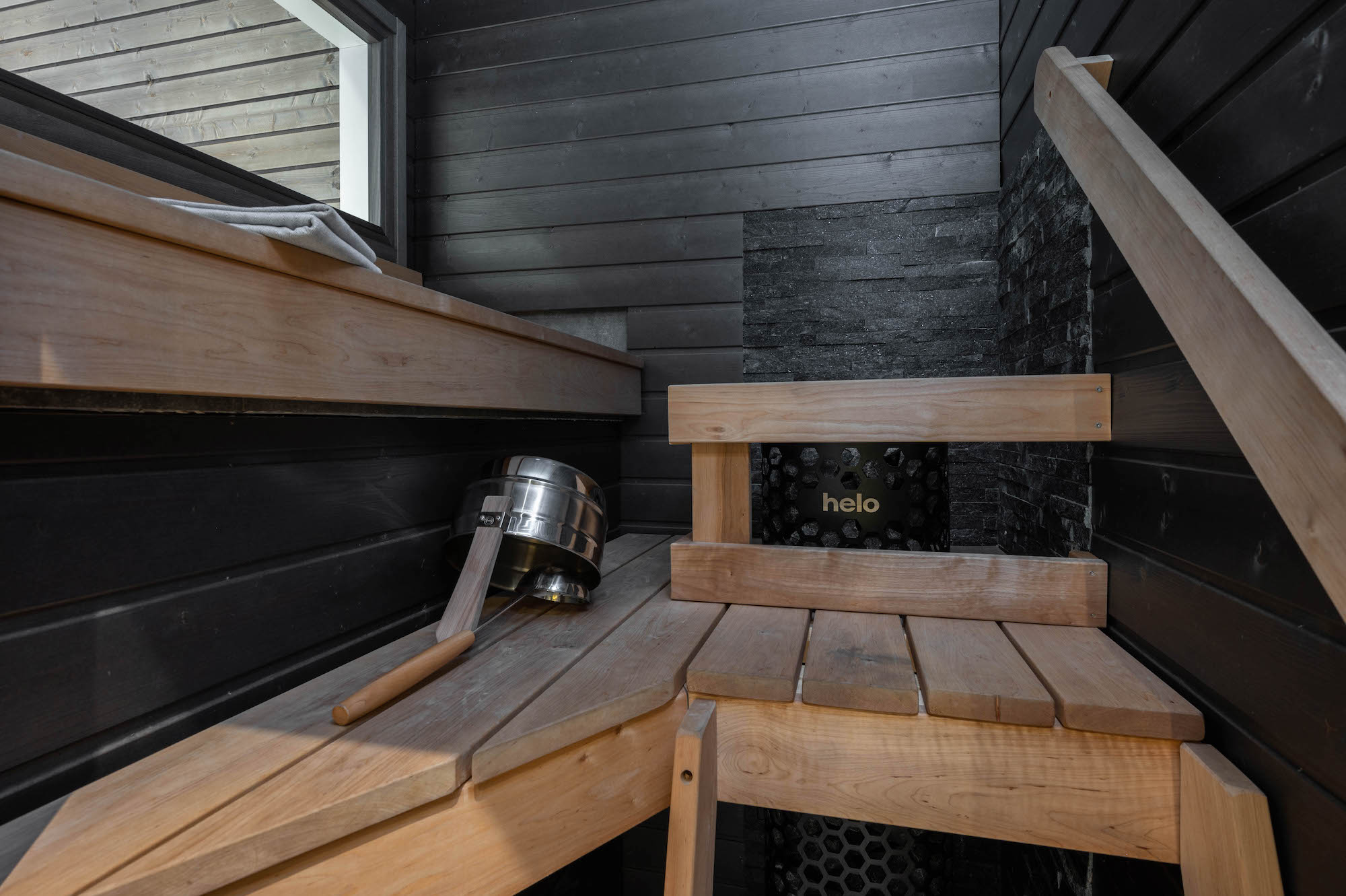 Huoneiston sydän on istuskelu- ja ruokailutila keittiösaarekkeen yhteydessä. Huoneistossa on oma sauna, ja tässä kohteessa saunan lauteet ovat hieman tavanomaista korkeammalla. Löylyistä pääset vilvoittelemaan omalle terassille sisäänkäynnin viereen. Oma sisäänkäynti katutasossa helpottaa liikkumista lasten kanssa. Sukset ja muut ulkoiluvälineet saat kätevästi lukittua terassin penkin sisälle.