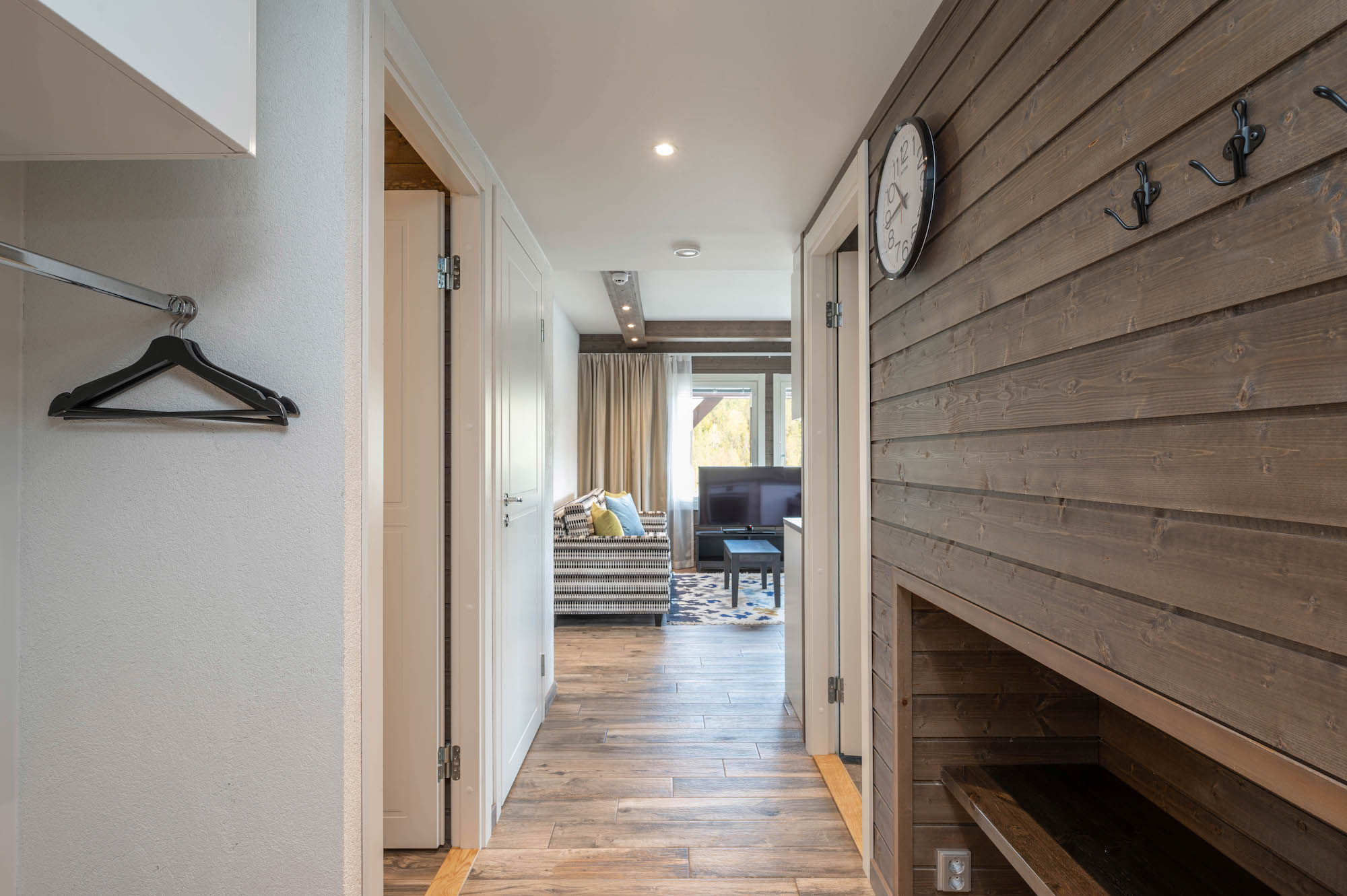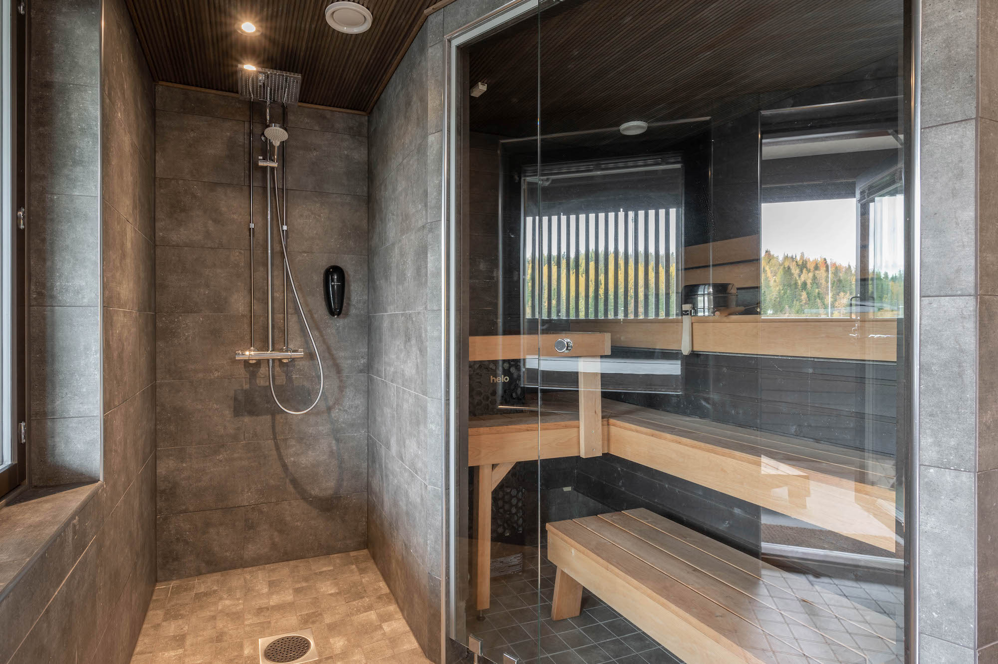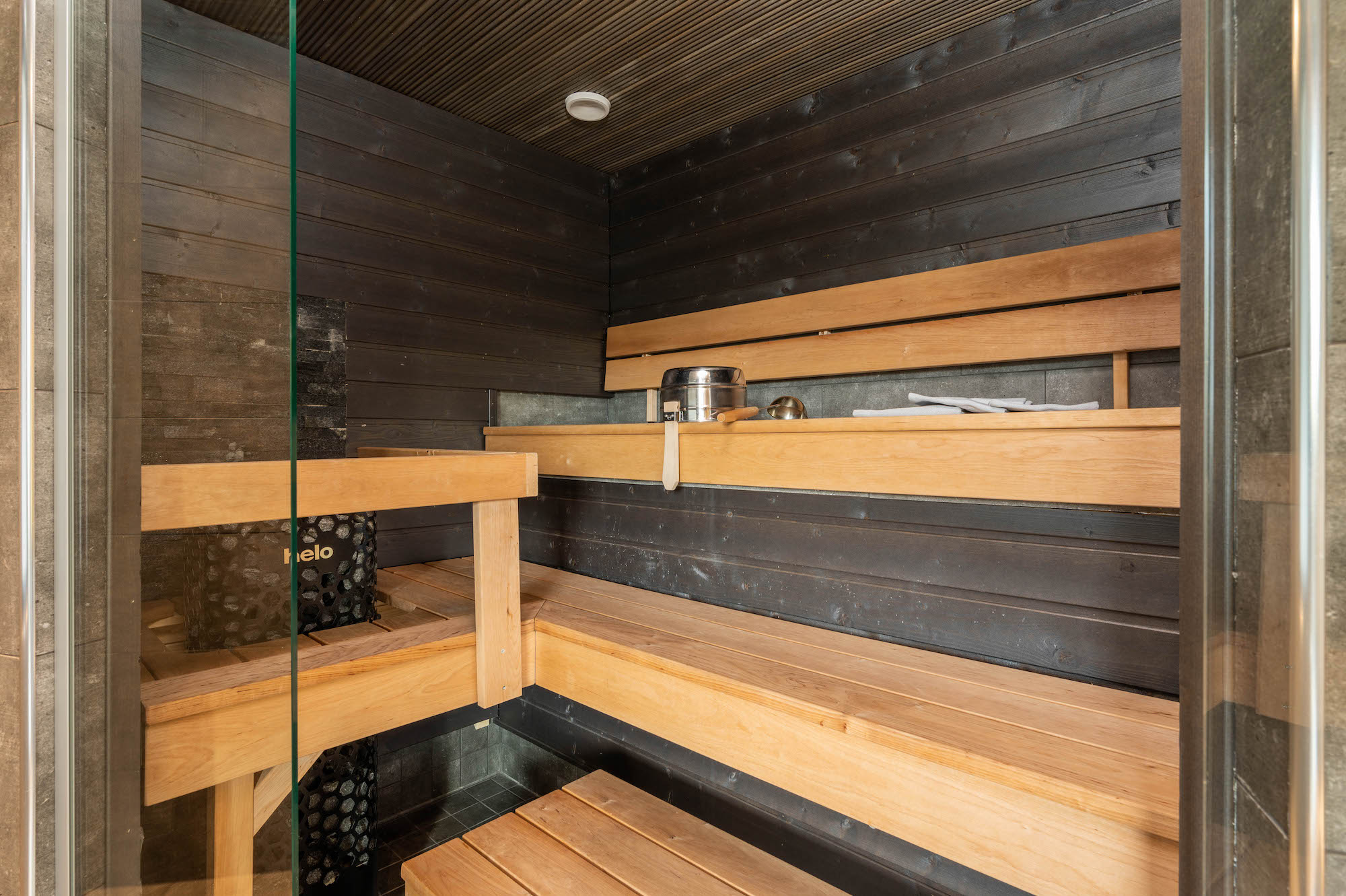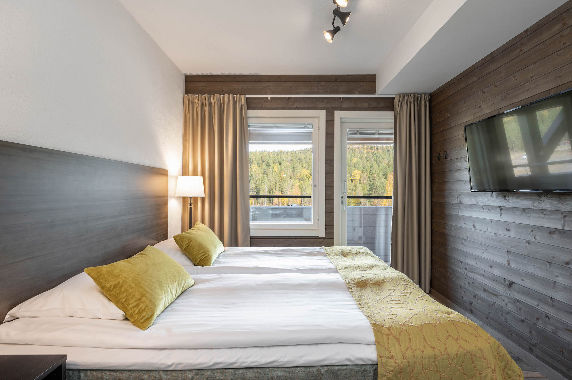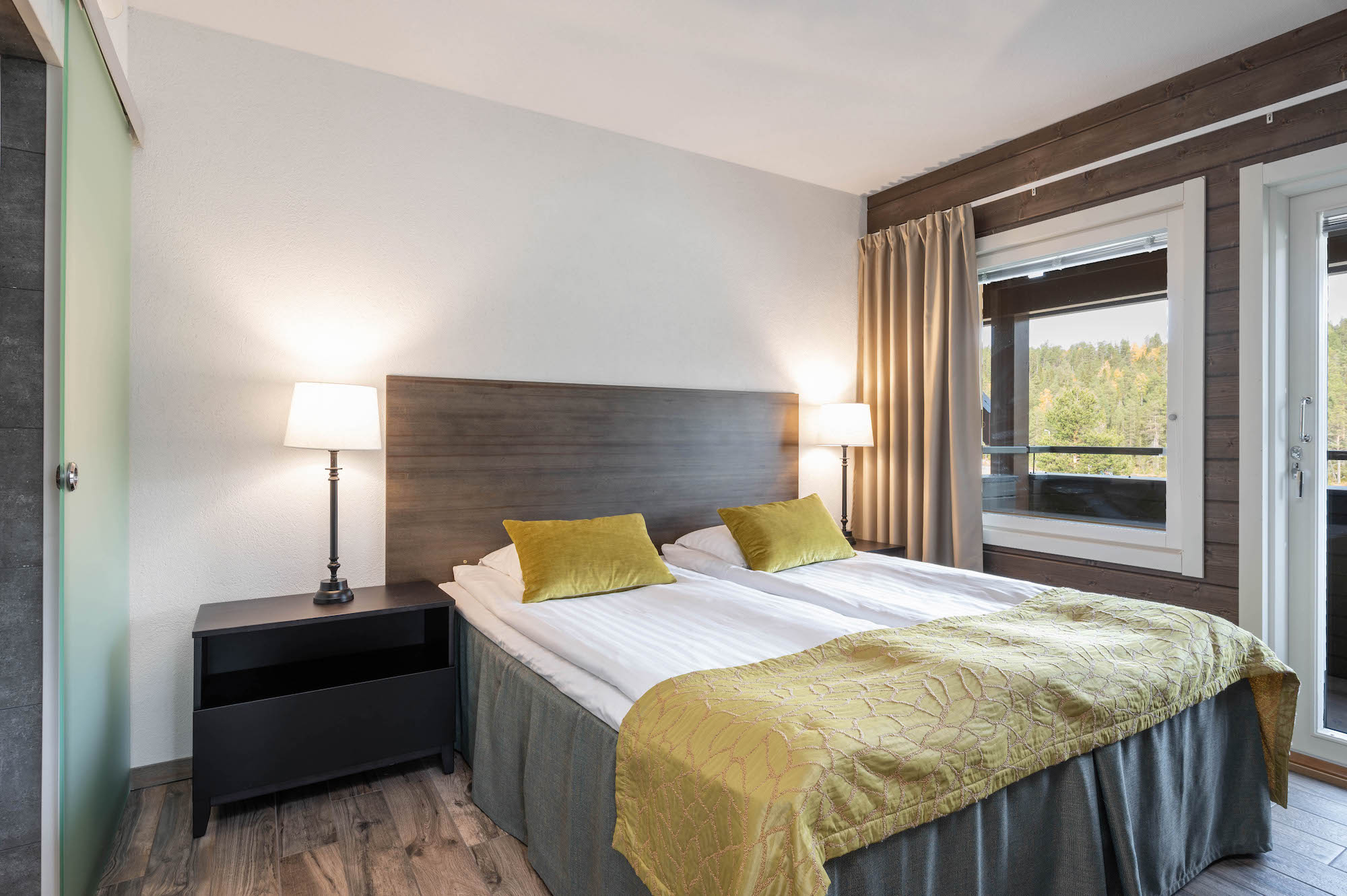 Laadukkaasti varusteltu ja tunnelmallinen huoneisto kahdella makuuhuoneella. Tilavassa päämakuuhuoneessa on kaksi muhkeaa vuodetta sekä oma WC ja suihku. Toisen makuuhuoneen kaksi vuodetta on mahdollista yhdistää parivuoteeksi. Olohuoneen sohvasta saa tarvittaessa levitettyä mukavan lisävuoteen kahdelle hengelle. Vaaleasävyisen avokeittiön vieressä on tilava ruokailutila, jonka ruokapöydän ympärillä vietetään laskupäivän iltaa isommallakin seurueella. Huoneiston helmi on valoisa saunaosasto, josta voi ihailla ympäröivää luontoa.