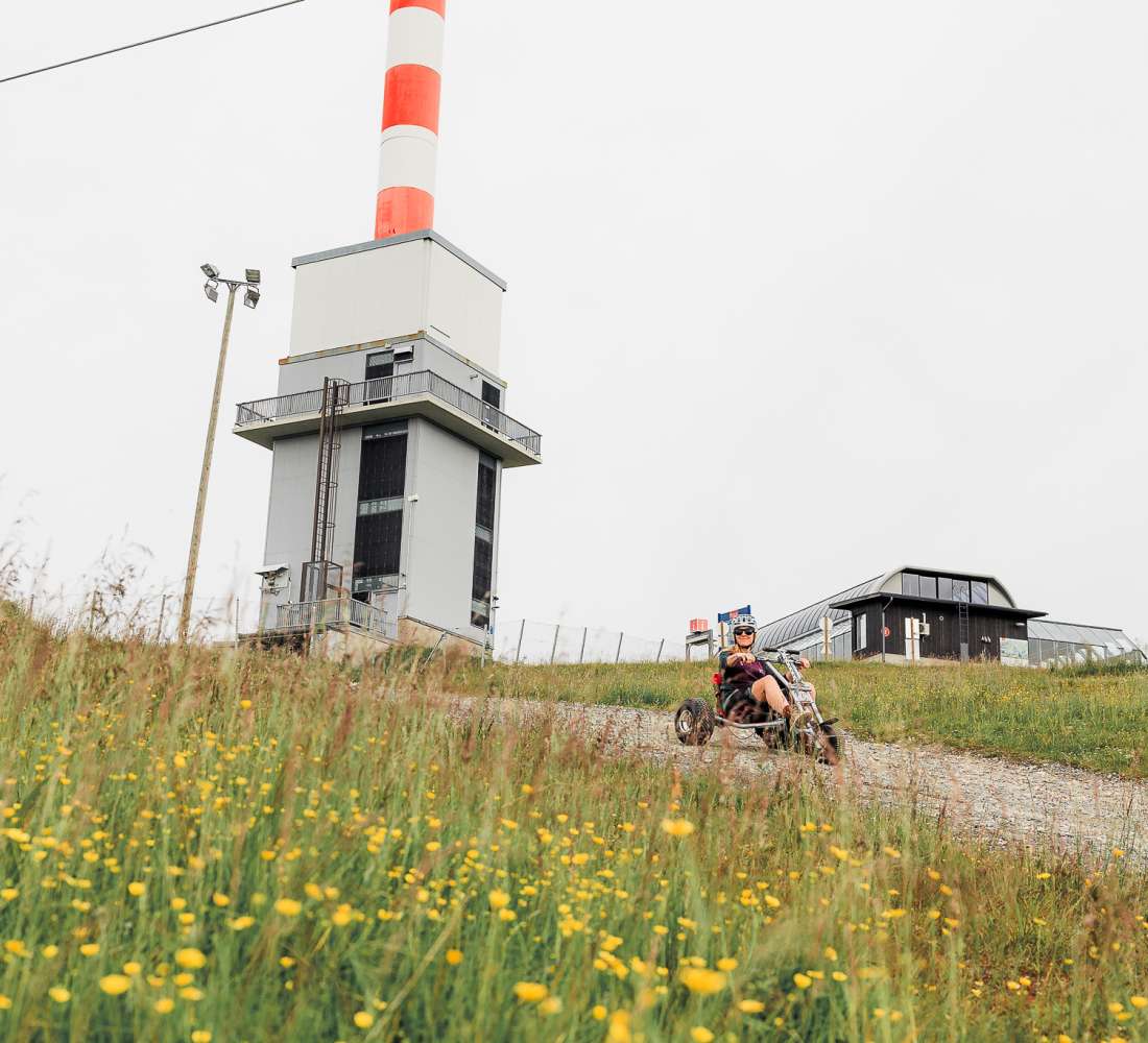 Rukan huipulta pääsee ajelemaan kesäisin myös mäkiautolla!