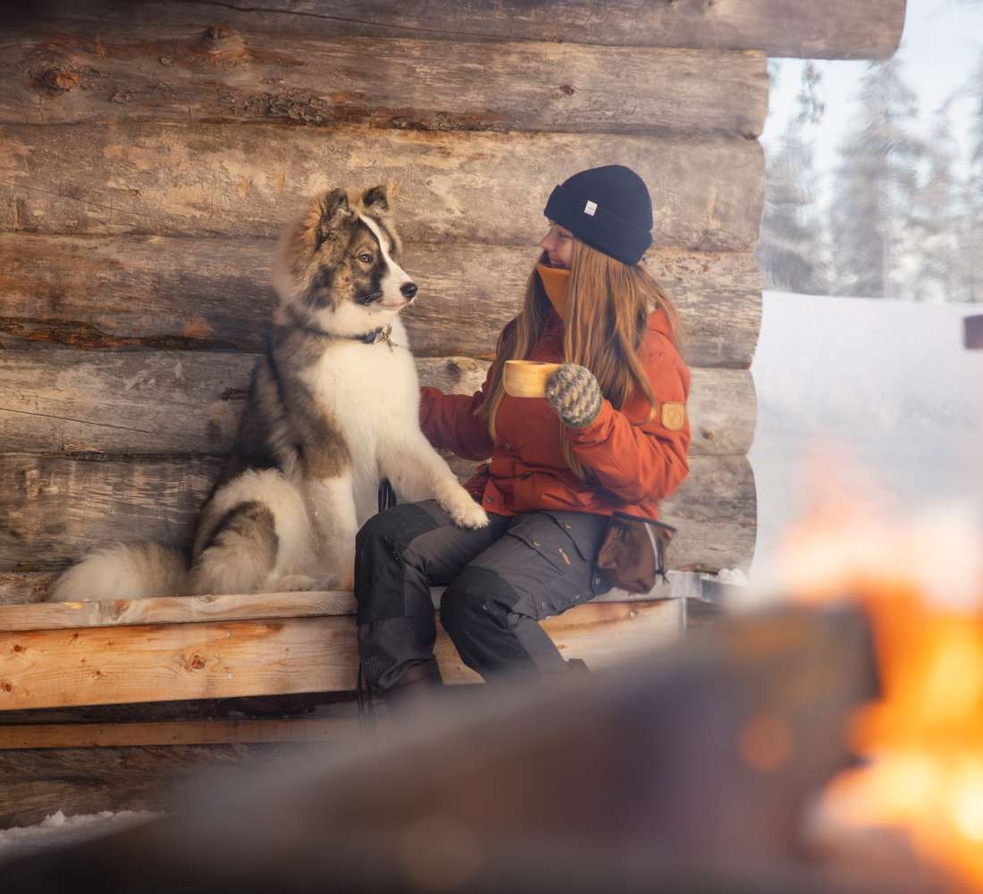 Nainen ja koira tauolla nuotiolla. Kuva Harri Tarvainen