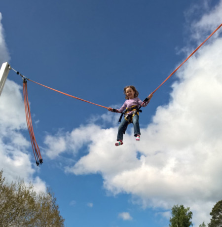 Benji-trampoliini on nimensä mukaisesti trampoliinihyppelyn ja benji-hypyn yhdistelmä. Valjaiden ja luotettavien lateksikuminauhojen avulla leijut maan ja taivaan välillä! Voit vaikka tehdä kaksoisvoltteja 6 metrin korkeudessa. Benji-trampoliinilla voit kokeilla kaikkia niitä temppuja, joita toivot uskaltavasi tehdä tavallisella trampoliinilla.