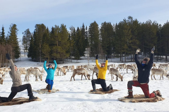 Joogaa porojen keskellä aidolla porotilalla. Nauti hyvinvoinnista luonnossa oppien poromaisia asanoita. Tutustu joogaaviin poroihin ja tilan käsityöpajaan ja myymälään.