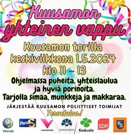 Kuusamon yhteistä vappujuhlaa juhlitaan Kuusamon keskustassa torilla keskiviikkona 1.5.2024 klo 11-13.